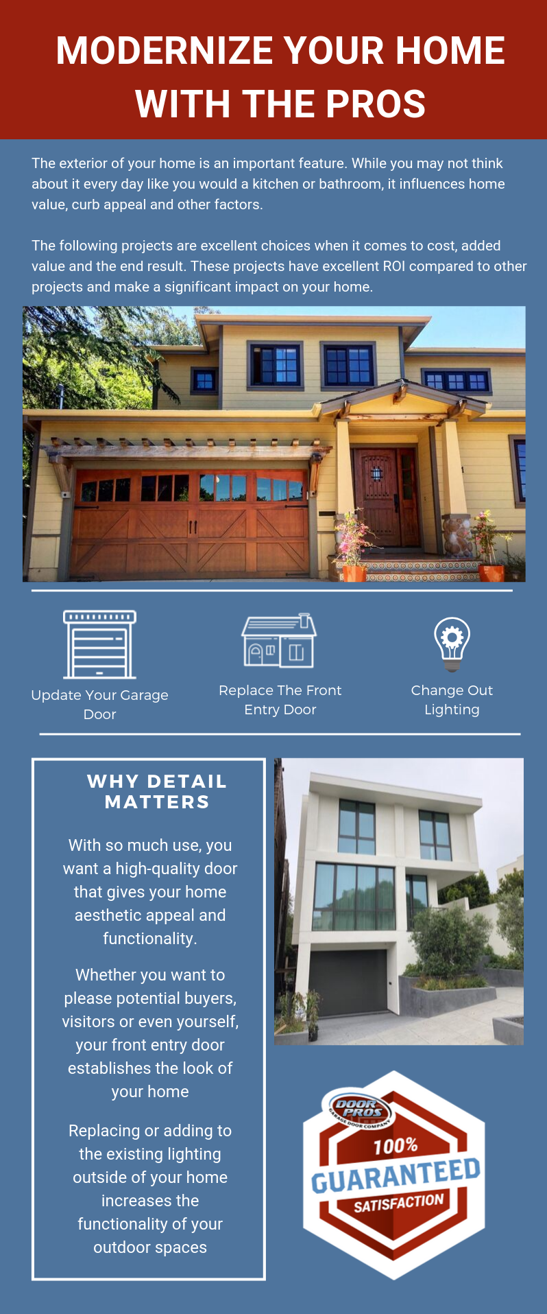 Whether you want to install a new residential garage door, upgrade your front entry door or change the lighting, Door Pros is your local expert to help you with these fantastic projects! Contact us today to learn more about our products and services or to request an estimate. Call Door Pros at 800-983-2608
